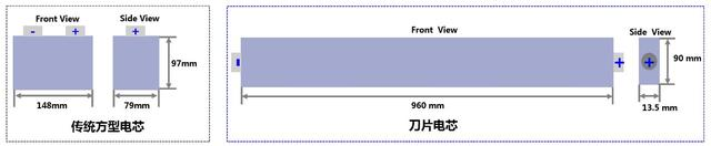 C公司產(chǎn)品的長度是148 mm、厚度是79mm、高度是97mm,內(nèi)部結(jié)構(gòu)是卷繞,看起來像一塊板磚。刀片電芯長度是960mm,厚度是 13.5 mm,高度為 90 mm,內(nèi)部結(jié)構(gòu)是疊片。因其長而薄的形狀酷似刀片,因此得名刀片電池。